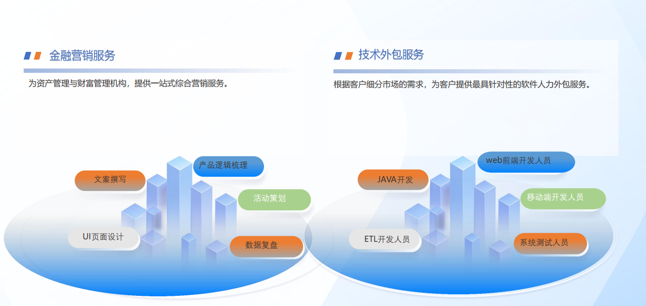 外包駐場(chǎng)服務(wù)?: 提供金融IT技術(shù)人力外包及營(yíng)銷運(yùn)營(yíng)支持,涵蓋開(kāi)發(fā)、測(cè)試、設(shè)計(jì)等領(lǐng)域。